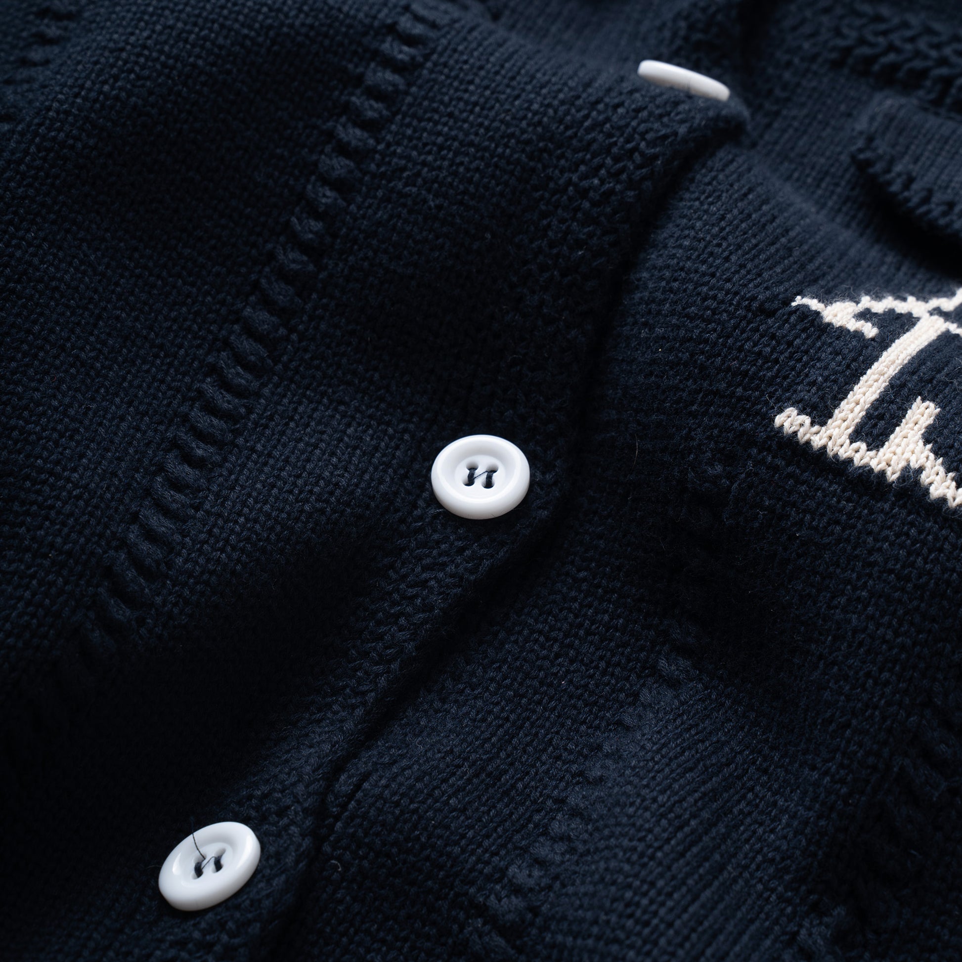 This navy knit jacket is a new addition to your wardrobe for the beginning of the year. It is made from familiar cotton knit material and comprises 100% soft and breathable cotton fibers. The unique weaving features horizontal raking and vertical khebun patterns, creating a surface that is both distinctive and interesting.