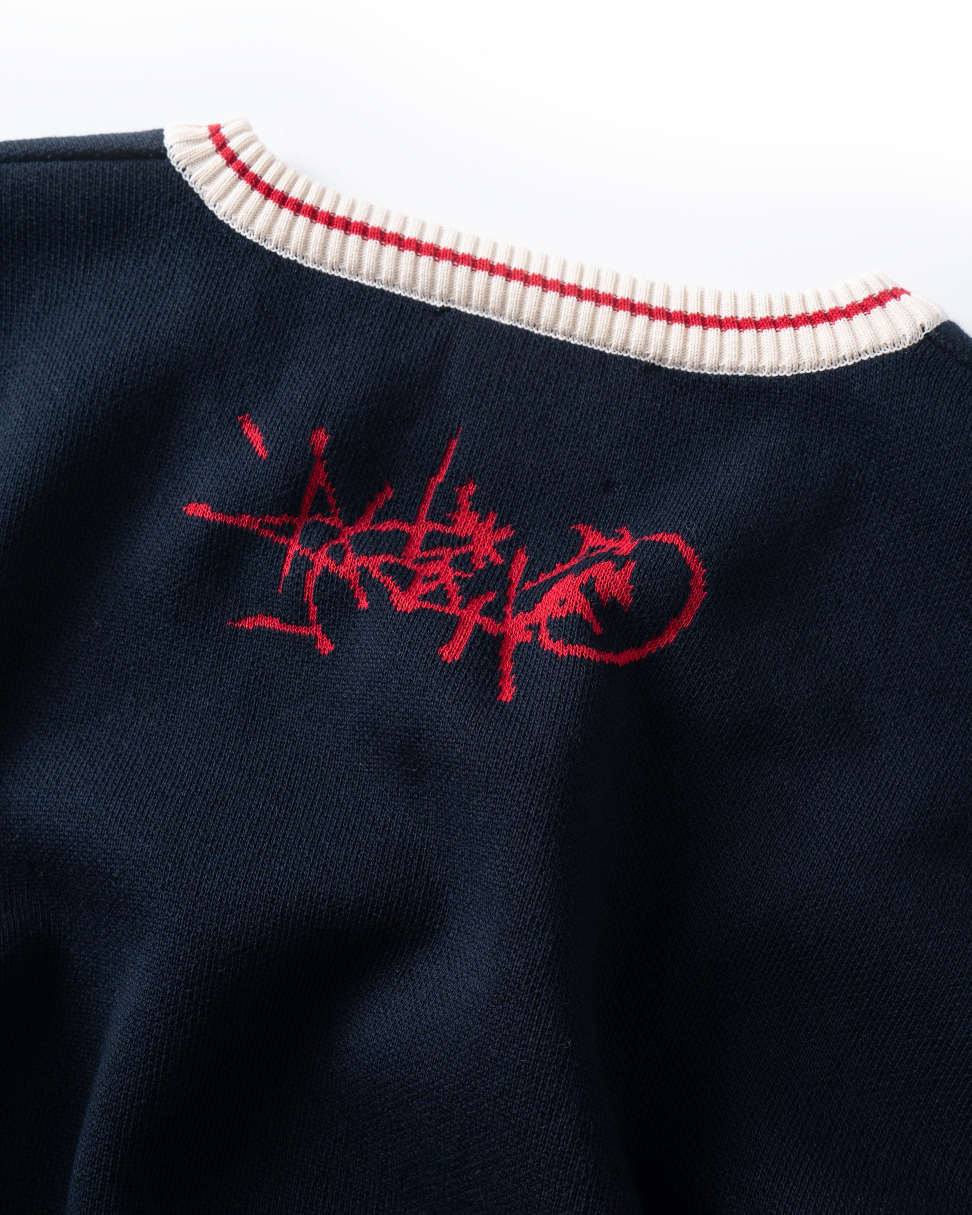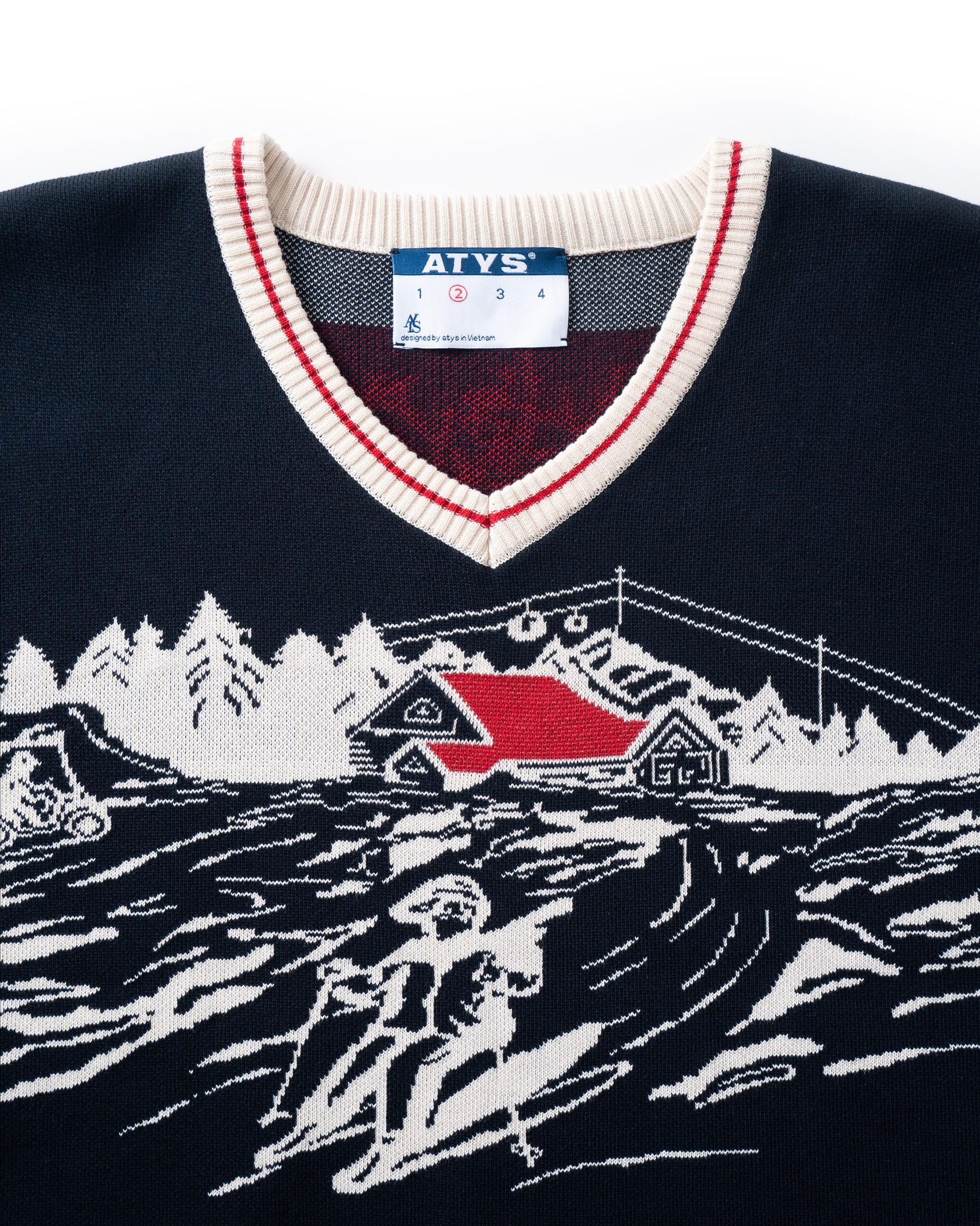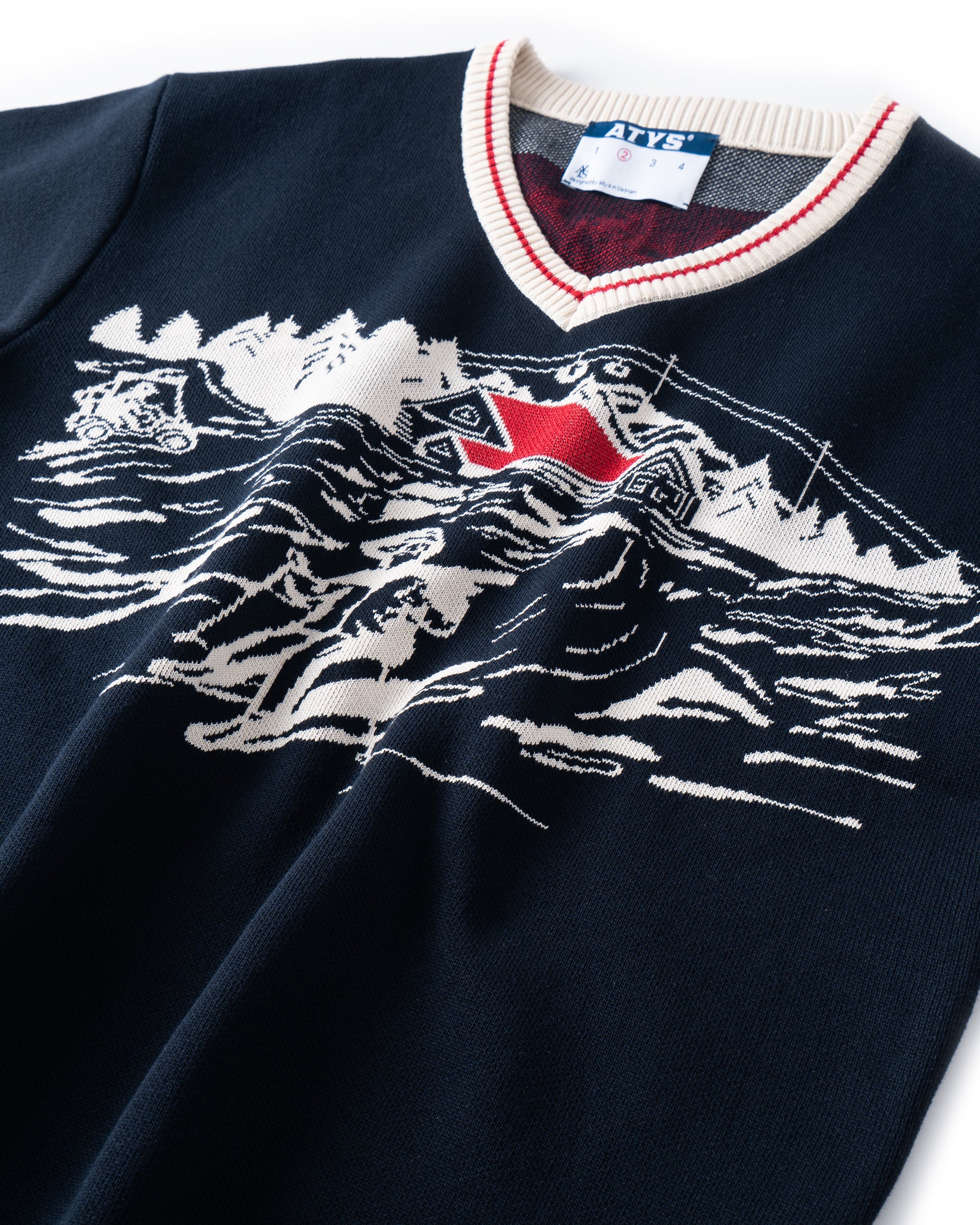 A refined yet minimalist take on the "Mountain Dream," this V-neck knit with striped trim exudes comfort and effortless style in every detail.